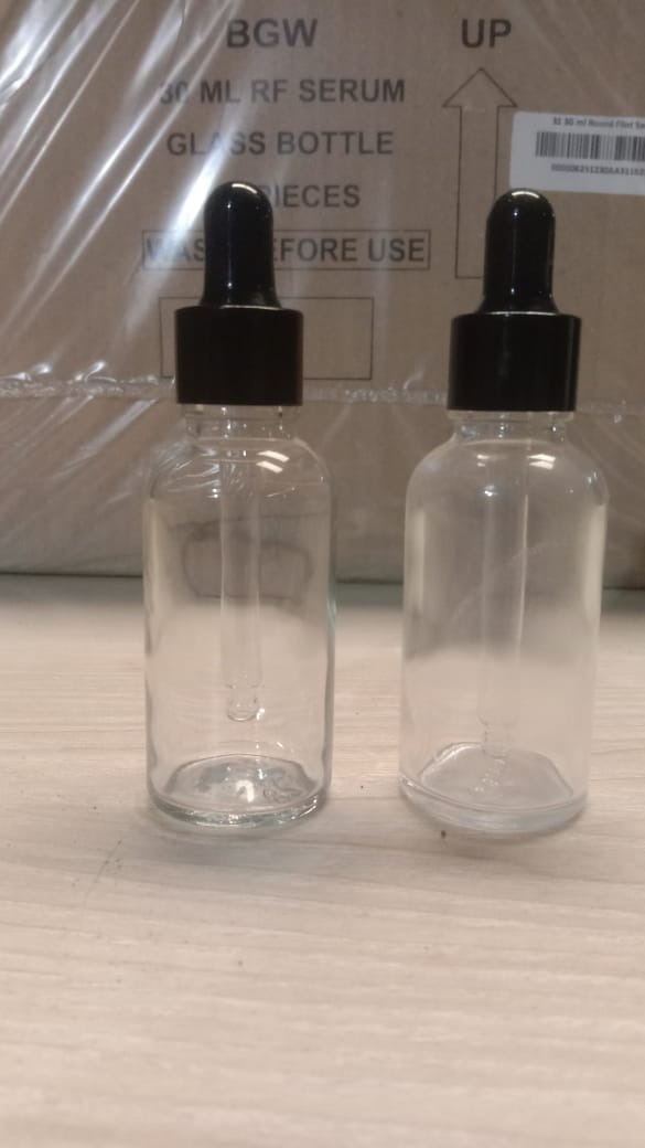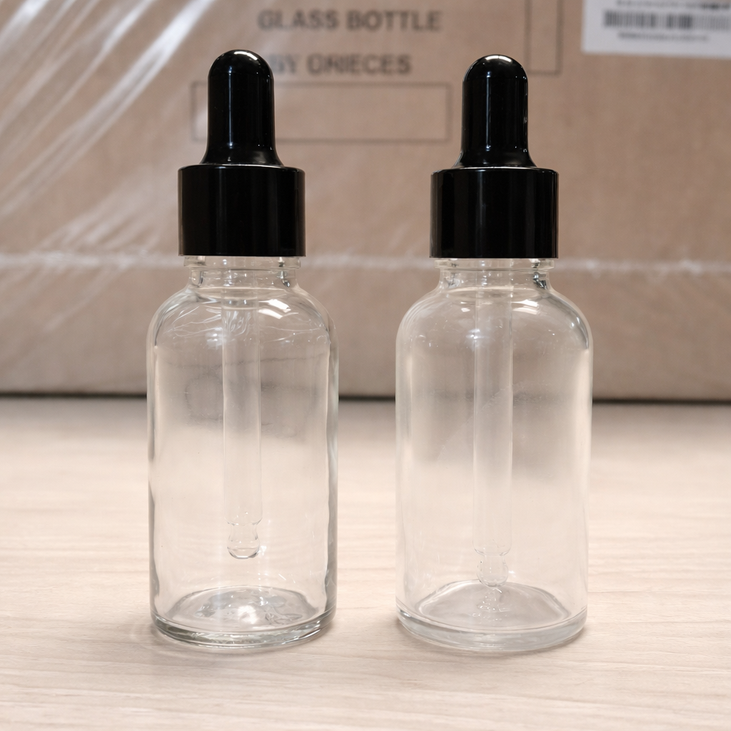 ● CLEAR GLASS DROPPER BOTTLES, ADDITIONAL WHITE CAPS AND PLUGS WITH EVERY BOTTLE, TO MAKE IT 100% LEAK PROOF