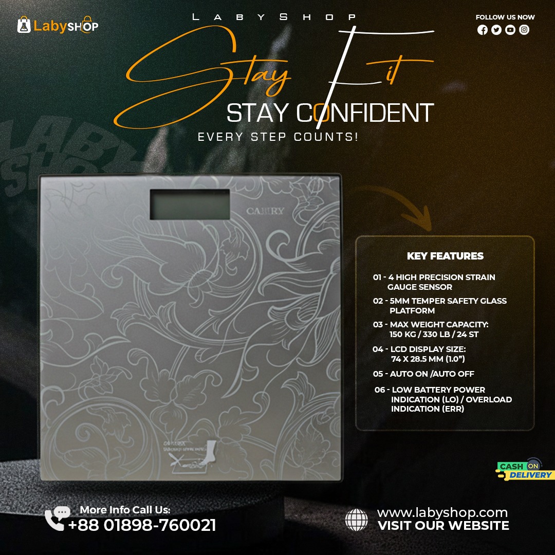 The Camry EB9460 Digital Bathroom Weight Scale is a high-precision, modern bathroom scale designed for reliable and accurate body weight measurement. With a maximum capacity of 150 kilograms, it is perfect for home use, personal health tracking, and fitness monitoring. Its sleek design, clear digital display, and user-friendly operation make it a must-have accessory for maintaining a healthy lifestyle.